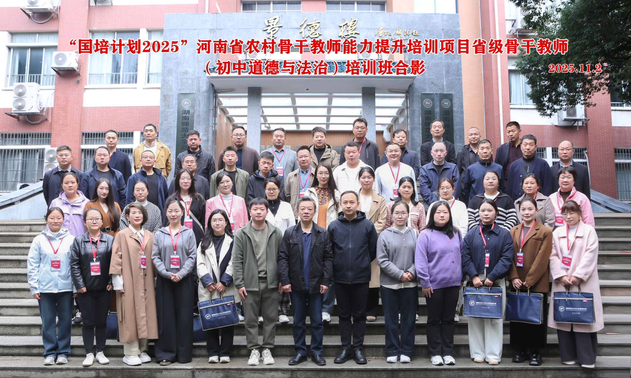 2025年11月2日上午8时,“国培计划2025”-河南省农村骨干教师能力提升项目省级骨干教师(初中道德与法治)培训班开班典礼在我院博后楼三楼报告厅隆重举行。湖南省初中道德与法治名师培养对象、雅礼中学思政教师、雅礼丁江学校校长马明,我院副院长胡雪松、培训中心主任邹水平参加了典礼,典礼由培训中心副主任刘操主持。胡雪松代表学院对全体参训教师的到来表示热烈欢迎。他简要介绍了湖南师范大学的办学底蕴及公共管理学院的发...