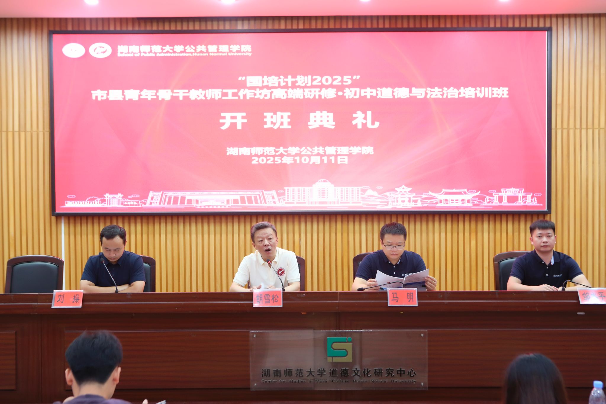 2025年10月11日上午8点,“国培计划2025”市县青年骨干教师工作坊高端研修·初中道德与法治培训班开班典礼在我院三楼报告厅隆重举行。长沙市雅礼中学思政教师、雅礼丁江学校校长马明、我院副院长胡雪松、培训中心主任邹水平出席了典礼,典礼由我院行政办副主任刘操主持。