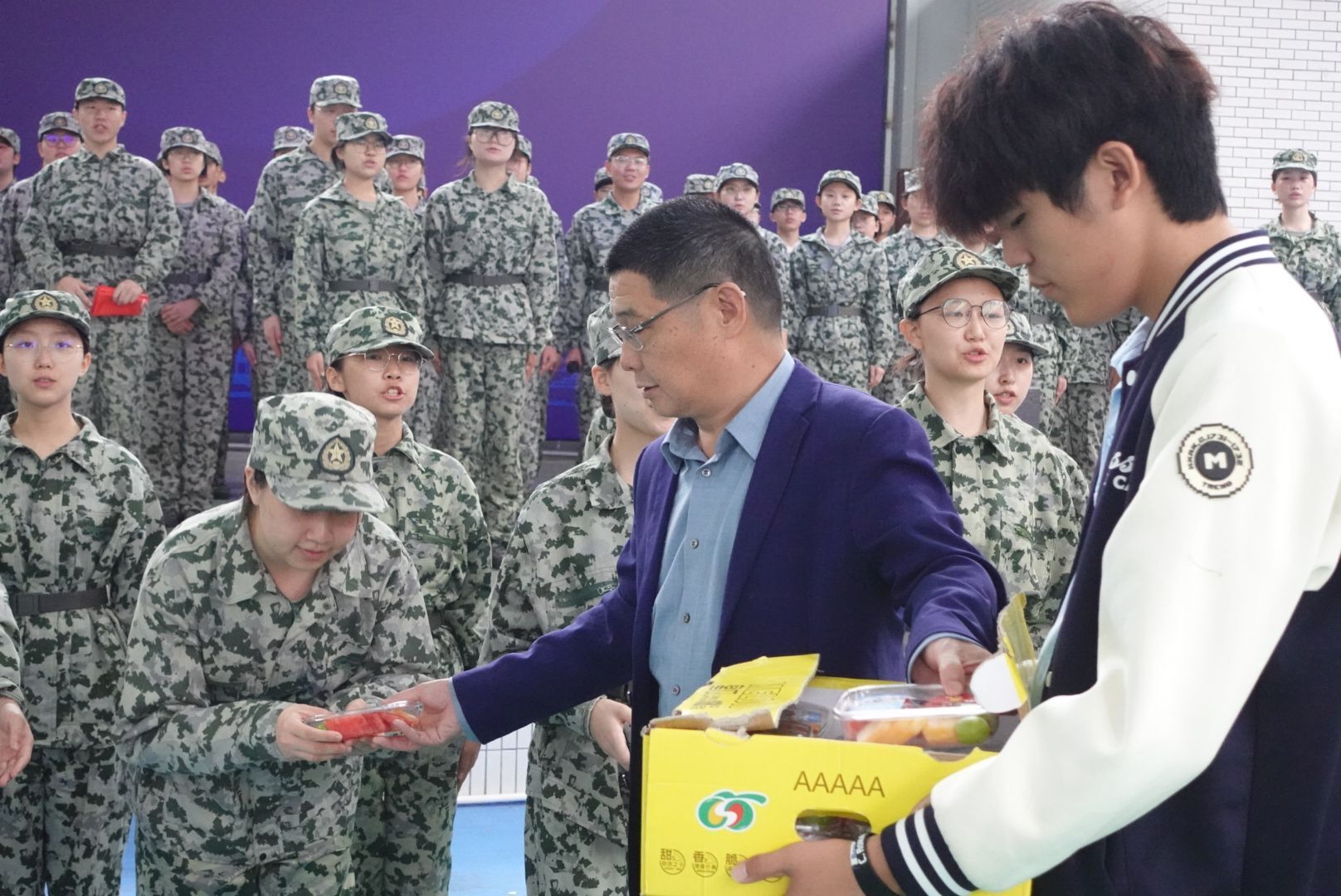 余望成、毛新志现场观摩队列行进、军姿训练等科目,与教官、军助及新生亲切交流,对大家的辛勤付出给予肯定与感谢,还重点了解军训训练强度及新生身心适应情况,强调要科学参训,细致查看医疗应急、饮用水补给等后勤保障细节,为参训教官及师生送上爱心水果。