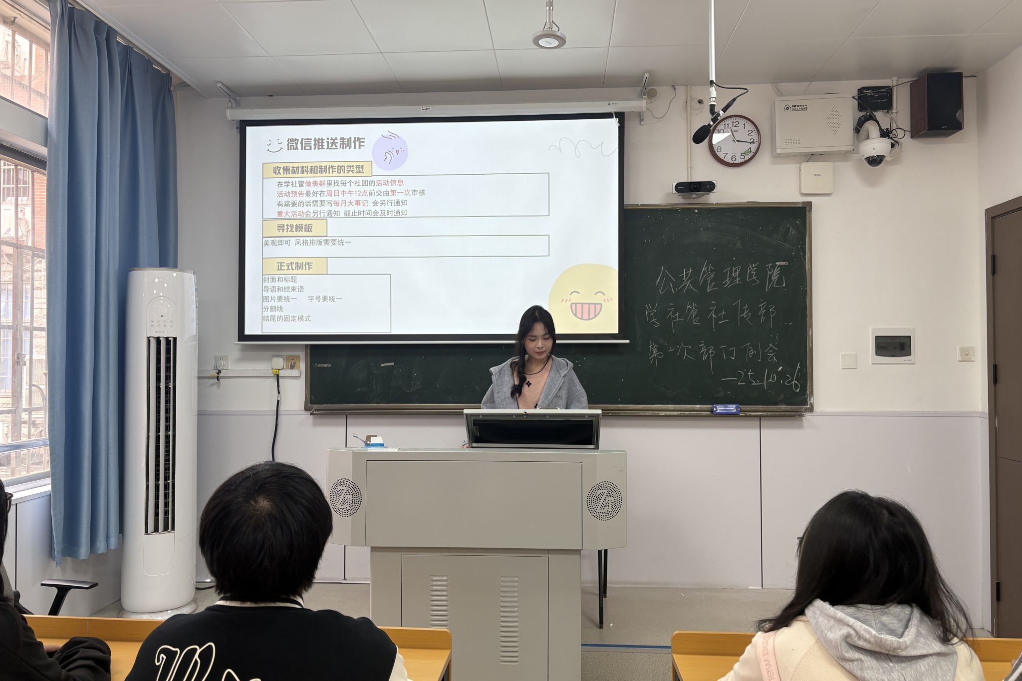 会议伊始,代莉文首先向新干事系统介绍部门主要职能——社团文化宣传,并对上一学年工作进行总结,分享了自己的工作心得,为新干事工作提供指导。钟嘉琪对新干事的宣传工作进行培训,讲述微信推送制作、QQ公众号运营的制作方法及工作流程,同时展示了优秀推送和照片、精美海报,提供宣传示范,并且提出了新闻投稿的相关注意事项。会议最后,四名新干事依次分享加入初衷与工作期待,针对“如何平衡文化专业性与传播趣味性”、“推送制作技巧”等疑问,钟嘉琪结合工作经验逐一解答,并分享实用工具与工作笔记。