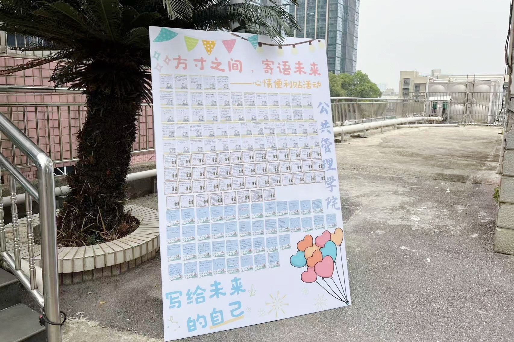 10月11日至24日,“解锁情绪,拥抱自我”心理健康主题班会由各班心女委牵头组织开展,活动照片经收集后在公管院微信公众号推送展示。同期,“方寸之间,寄语未来”心灵便利贴活动同步推进,同学们按照要求填写两张便利贴,大一、大二的同学分别向未来的自己作出自我关怀承诺、向大四学长学姐送上鼓励,心女委收集后交由健康服务部,在二里半校区景德楼与张公岭校区综合楼集中展示。