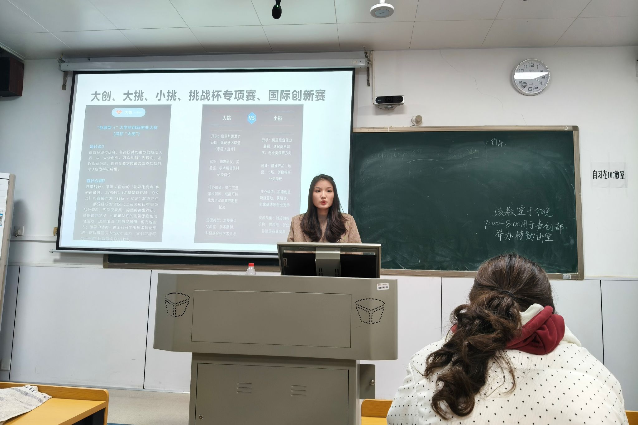 聂晨晨从前期准备,计划书,答辩和后期计划三大模块展开深度分享。在赛道与选题板块,聂晨晨拆解热门赛道选择逻辑,结合人工智能、乡村振兴、文化创新等赛事热门领域案例,讲解如何结合专业特色与市场需求选定优质选题;重点剖析创新创业计划书撰写重点,同时分享团队分工的高效技巧,帮助同学们厘清备赛框架、优化团队协作模式;答辩部分,则围绕准备时间分配、评委问题应对策略及心态调整方法展开,通过实战案例复盘,传授赛场答辩的实用技巧。