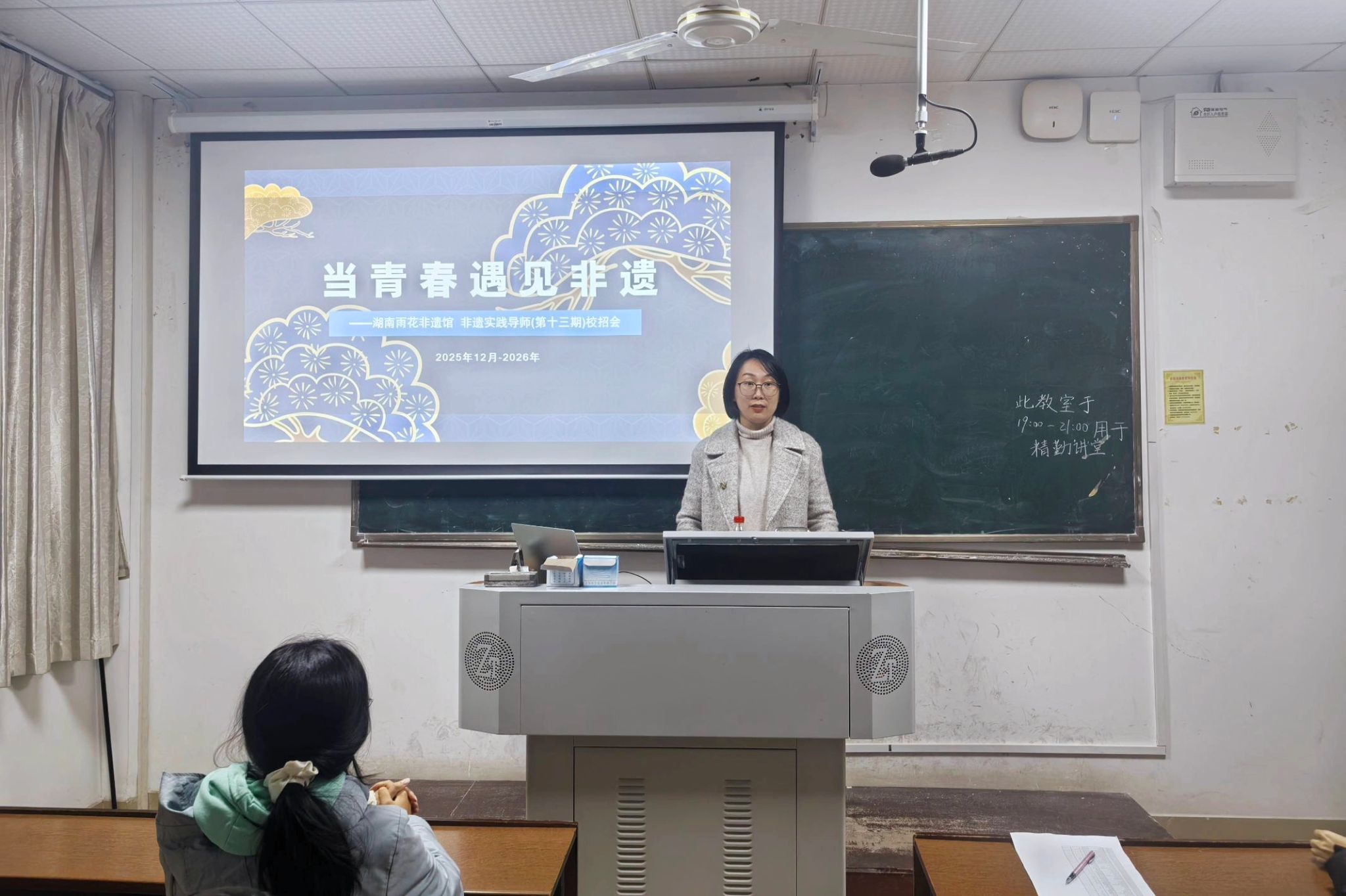 (通讯员 刘金瑶 曹晨曦 吴祖乐)为推动非遗进校园,培养优秀的非遗传播使者,公共管理学院(以下简称“公管院”)于12月12日晚在景德楼中栋311教室举办了以“匠心拾遗 薪火相传”为主题的精勤讲堂,此次精勤讲堂由湖南雨花非遗馆(湖南省铸牢中华民族共同体意识体验馆(长沙))馆长助理彭智慧担任主讲人,公管院2023级、2024级、2025级共50余名同学参加此次精勤讲堂。
