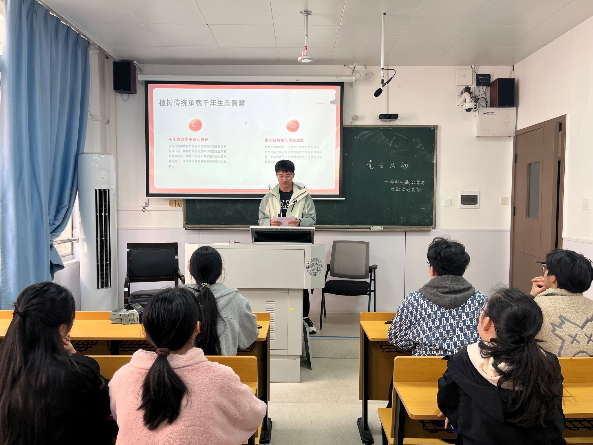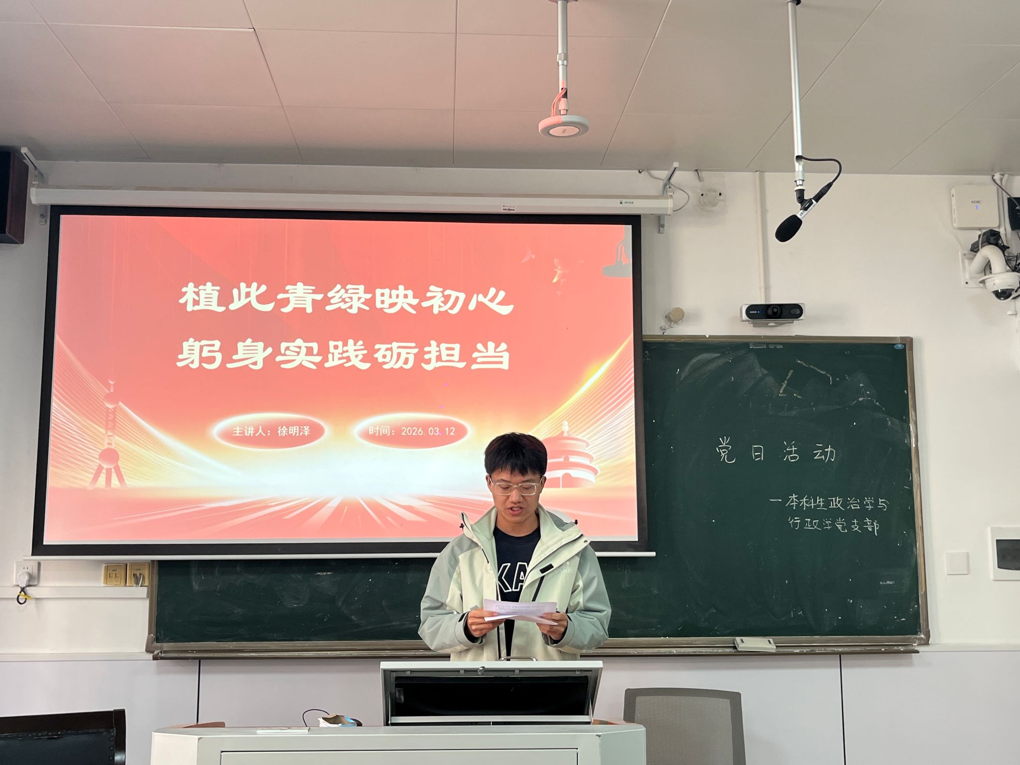徐明泽从“植绿传情”、“躬身践履”与“勇担使命”三个维度展开分享,他通过焦裕禄、谷文昌等案例诠释共产党人植绿为民、久久为功的崇高追求。为了让支部成员进一步深刻理解生态文明建设的青年使命,徐明泽阐述新时代青年需当好青绿家园的守护者、初心使命的践行者、时代发展的奋斗者,将绿色理念转化为实际行动。政行党支部成员认真聆听并记录,在互动过程中围绕“新时代青年党员如何投身绿色发展”展开讨论,一致认同青年应扎根实践、甘于奉献,把个人成长与生态保护、国家发展紧密结合。
