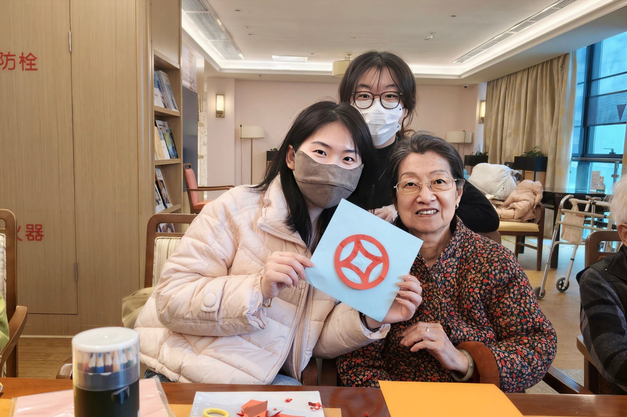 活动筹备阶段,刘梦瑶提前与工作人员对接,了解老人的作息时间与身体状况。参与同学在工作人员引导下按照规划摆放桌椅,将剪纸素材与绘画材料摆放至指定区域,确保活动内容适合老年人参与。活动正式启动后,同学们分组坐在老人身边倾听老人们结合自身经历讲述的生活经历和工作往事,部分同学在旁认真倾听记录并分享自己的校园生活,现场交流氛围轻松融洽。在手工环节,同学们与老人一起进行简单手工制作。部分老人有较好的手工基础,主动指导同学剪出花样;部分老人视力或手部活动受限,同学在旁协助描边、剪纸,合作完成作品。活动过程中,双方互动频繁,现场秩序良好。
