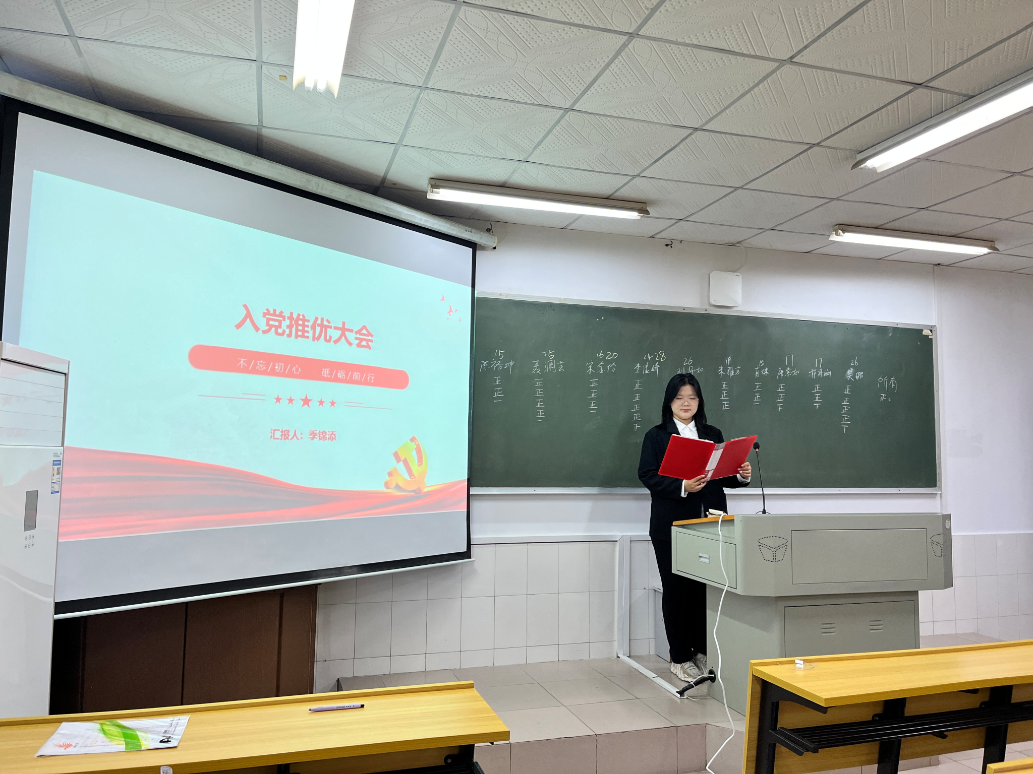会议由班级团支部书记季锦添主持,特殊情况由组织委员协助开展。会前,团支部对照推优条件,拟定差额比例为20%的候选人名单,为推优工作做好充分准备。