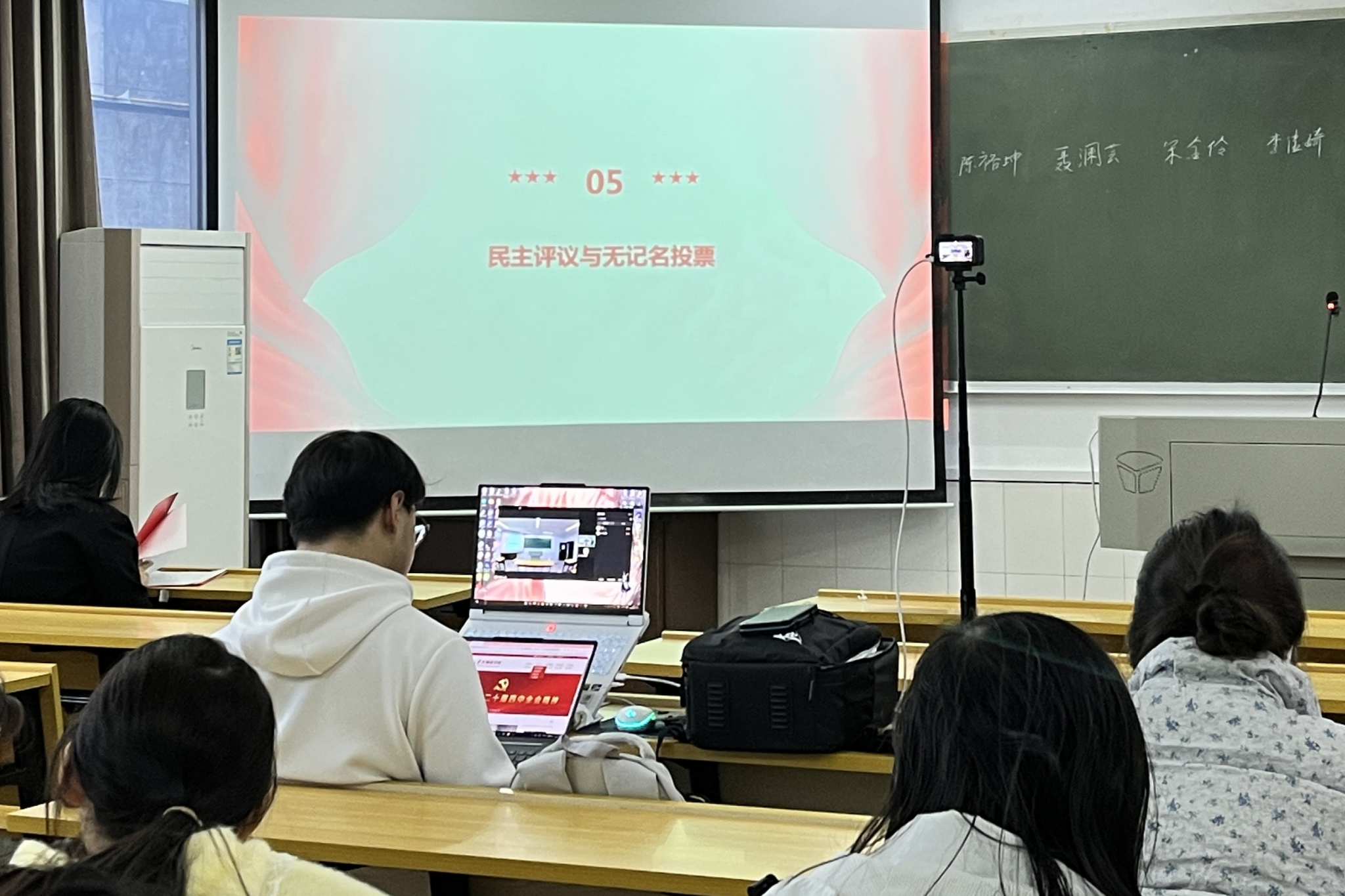 候选人依次上台进行自我总结与评价,全面汇报自身在思想学习、志愿服务、班级工作等方面的表现与成长。党支部学姐通过线上直播方式参与会议指导,全程监督推优过程。