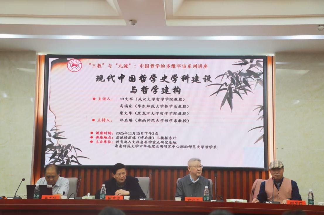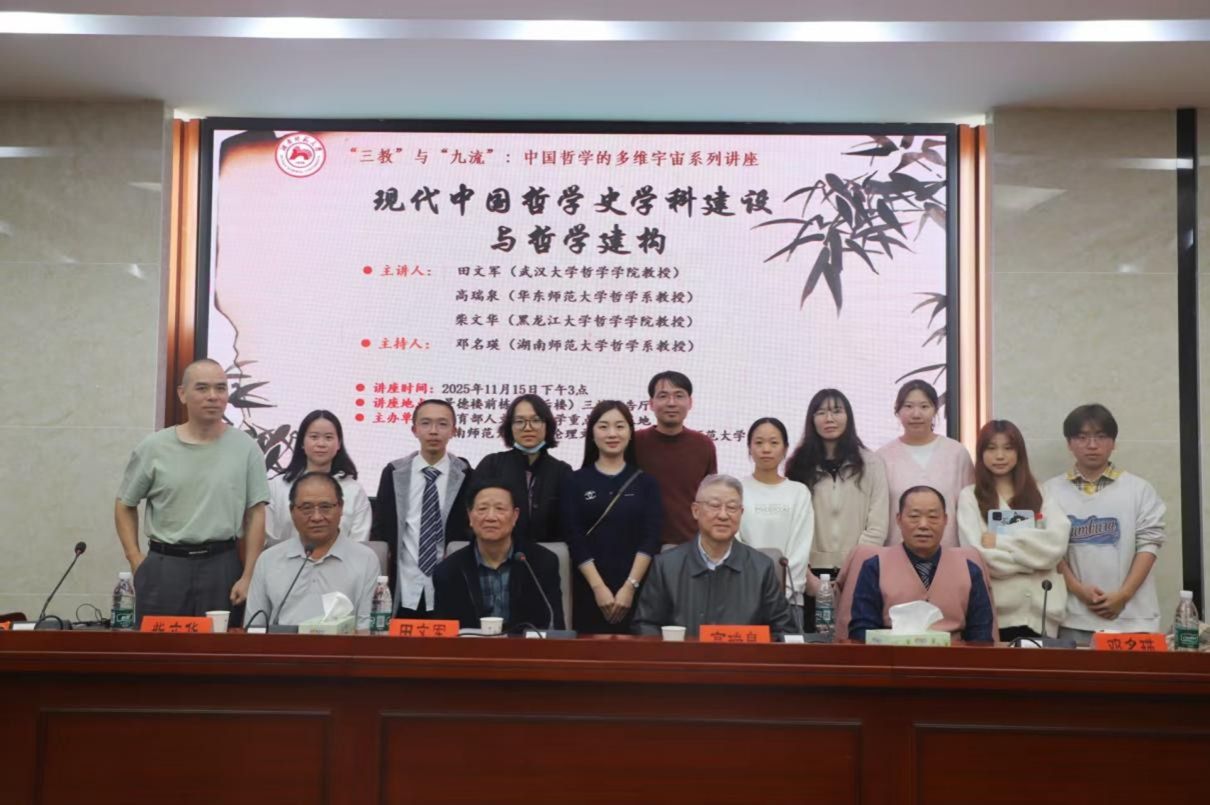 (通讯员 曹飞艳)11月15日下午,武汉大学田文军教授、华东师范大学高瑞泉教授、黑龙江大学柴文华教授应邀莅临我院哲学系,作题为“现代中国哲学史学科建设与哲学建构”的学术讲座。本次讲座由哲学系邓名瑛教授主持,哲学系四十余名博士生、硕士生参加了讲座。