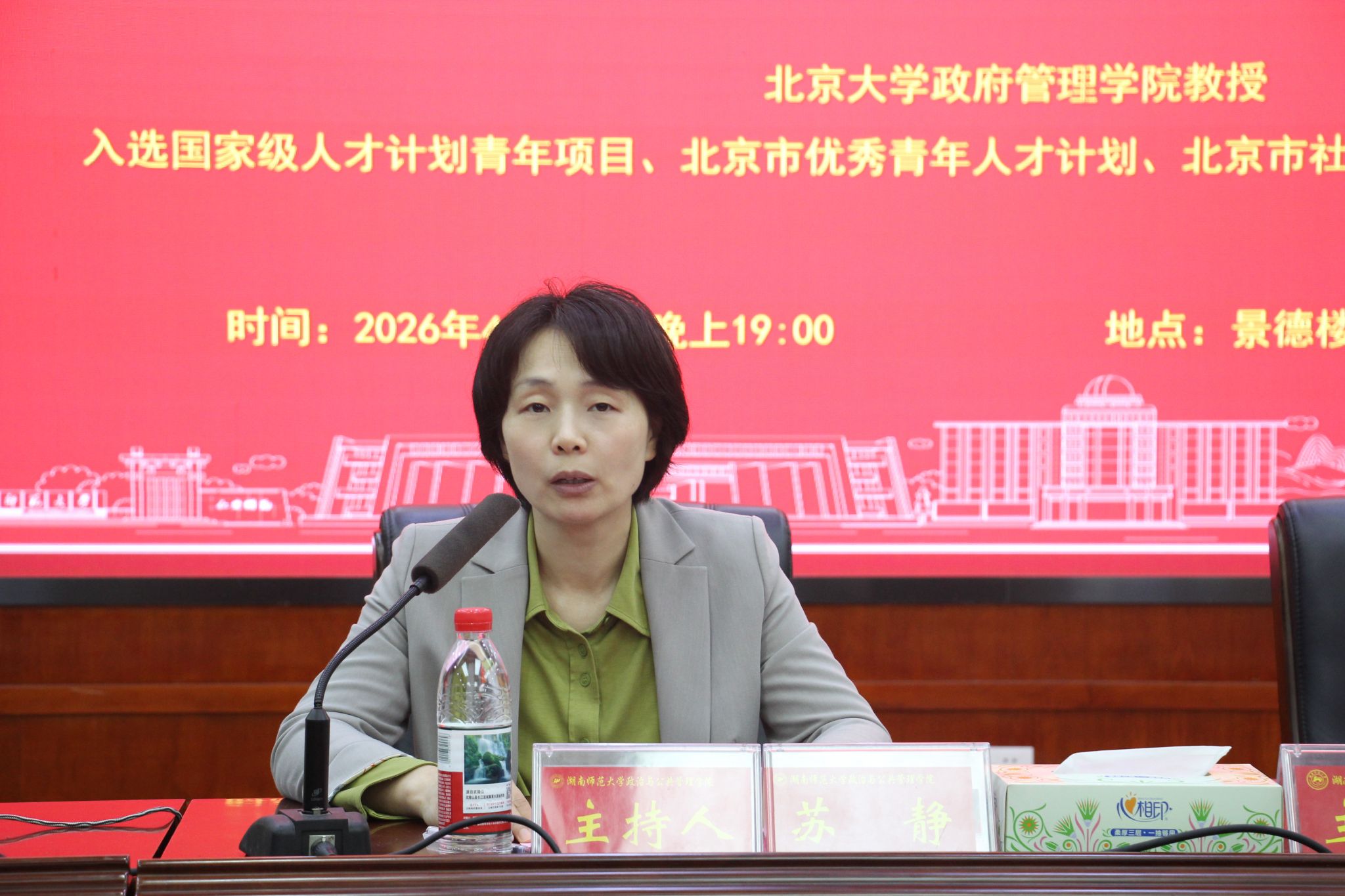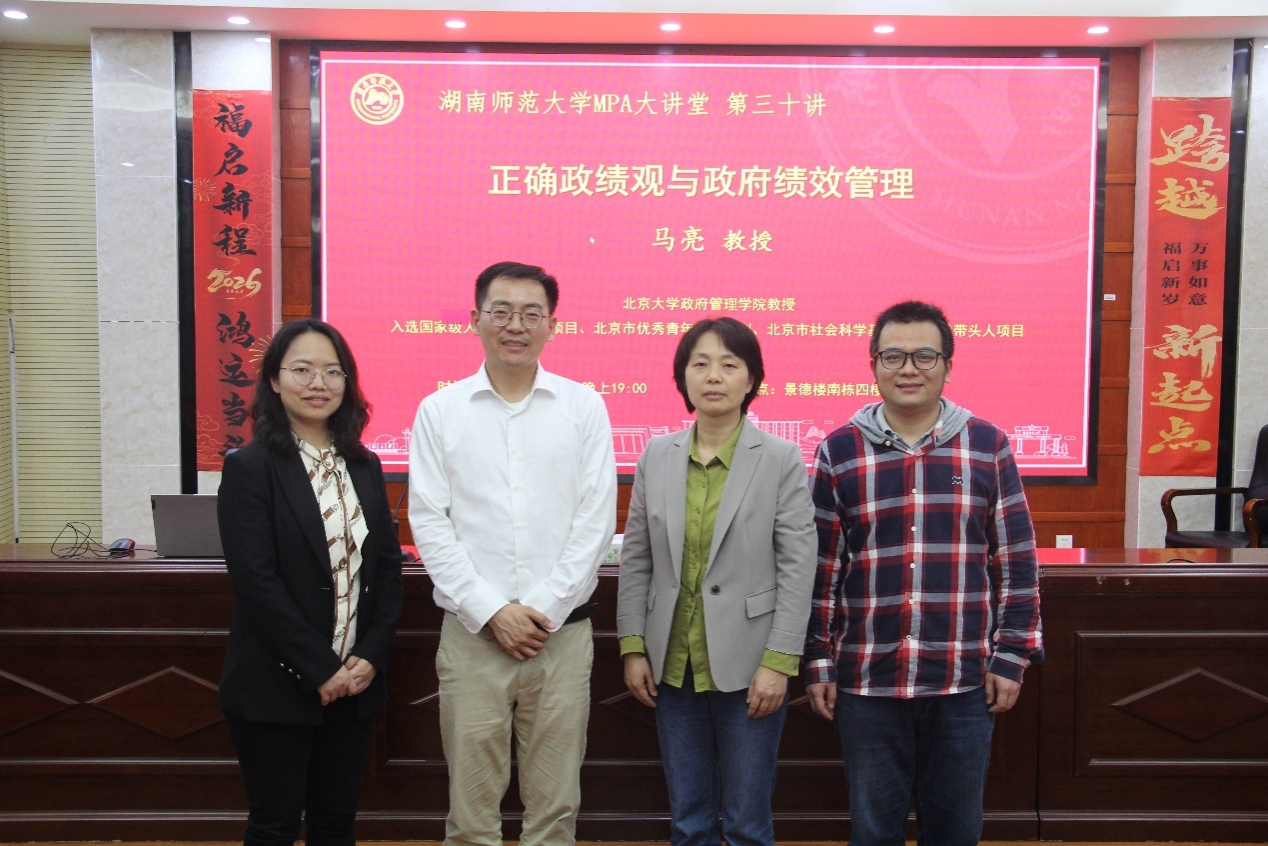 (通讯员 仪如)4月11日晚上,湖南师范大学MPA大讲堂第三十讲在景德楼南栋四楼学术报告厅成功举行。北京大学政府管理学院马亮教授应邀为我院师生作题为“正确政绩观与政府绩效管理”的学术讲座。讲座由政治与公共管理学院副院长苏静教授主持,MPA教育中心执行主任刘茜教授、陈婧教授、袁青副教授、谢宗藩副教授等老师现场参加,MPA研究生及学院相关专业本科生、学术型研究生参加讲座。
