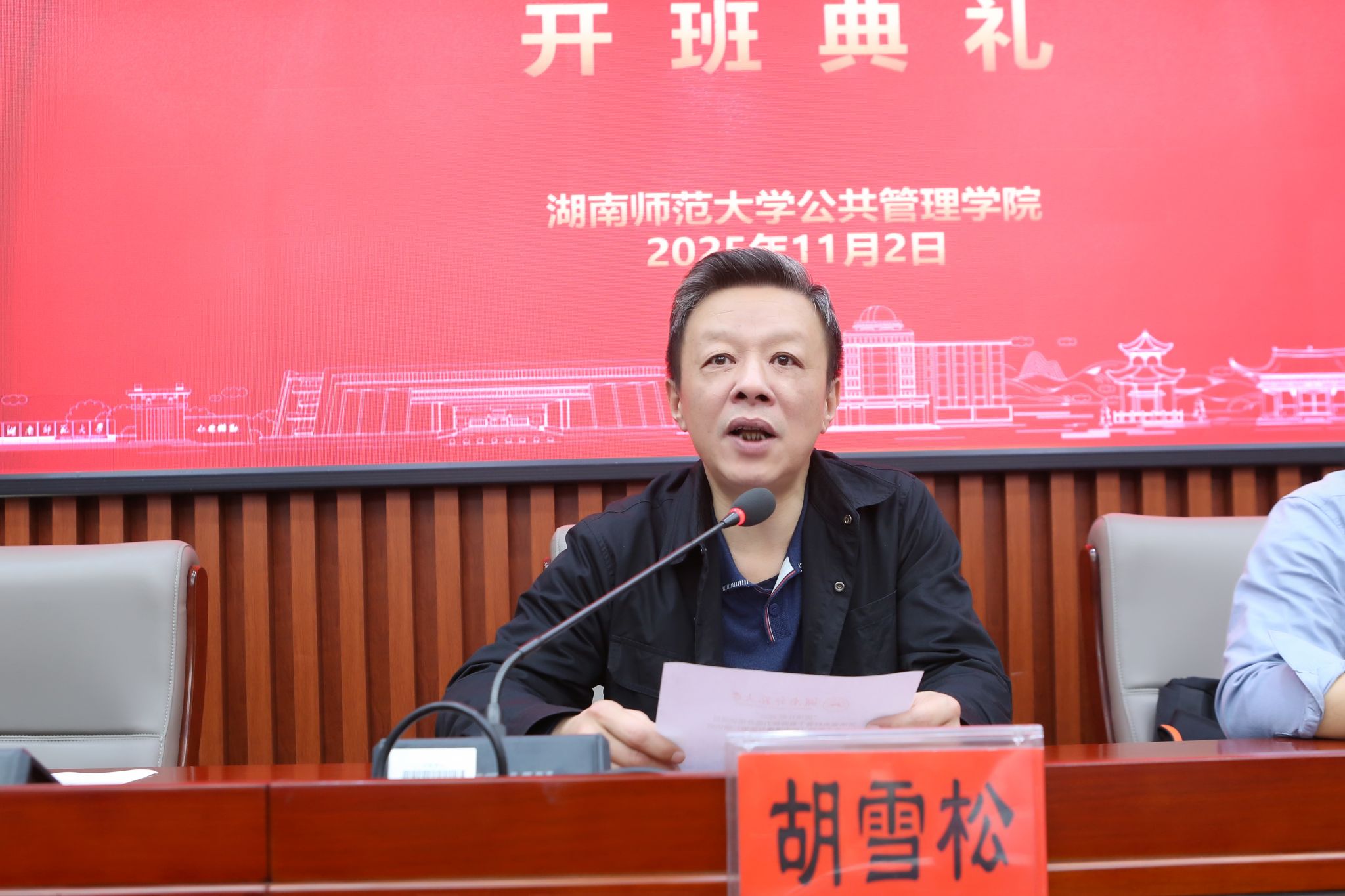 胡雪松代表学院对全体参训教师的到来表示热烈欢迎。他简要介绍了湖南师范大学的办学底蕴及公共管理学院的发展概况,重点分享了学院在继续教育、干部培训领域积累的经验与成果,并预祝本次培训圆满成功。